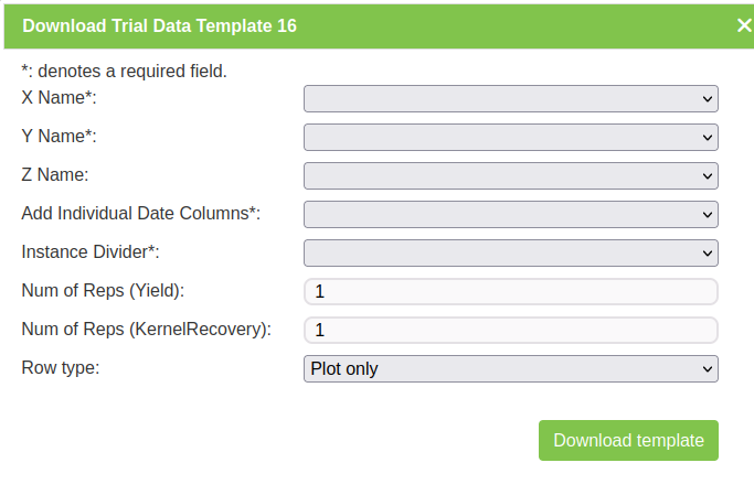 | Trial ID Column | Mandatory | Column number for trial ID (nurseries use a trial ID). |