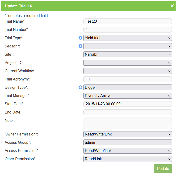 | Trial Type | Mandatory | Select from the list of trial types (A general type as opposed to design type which is a trial specific definition). |