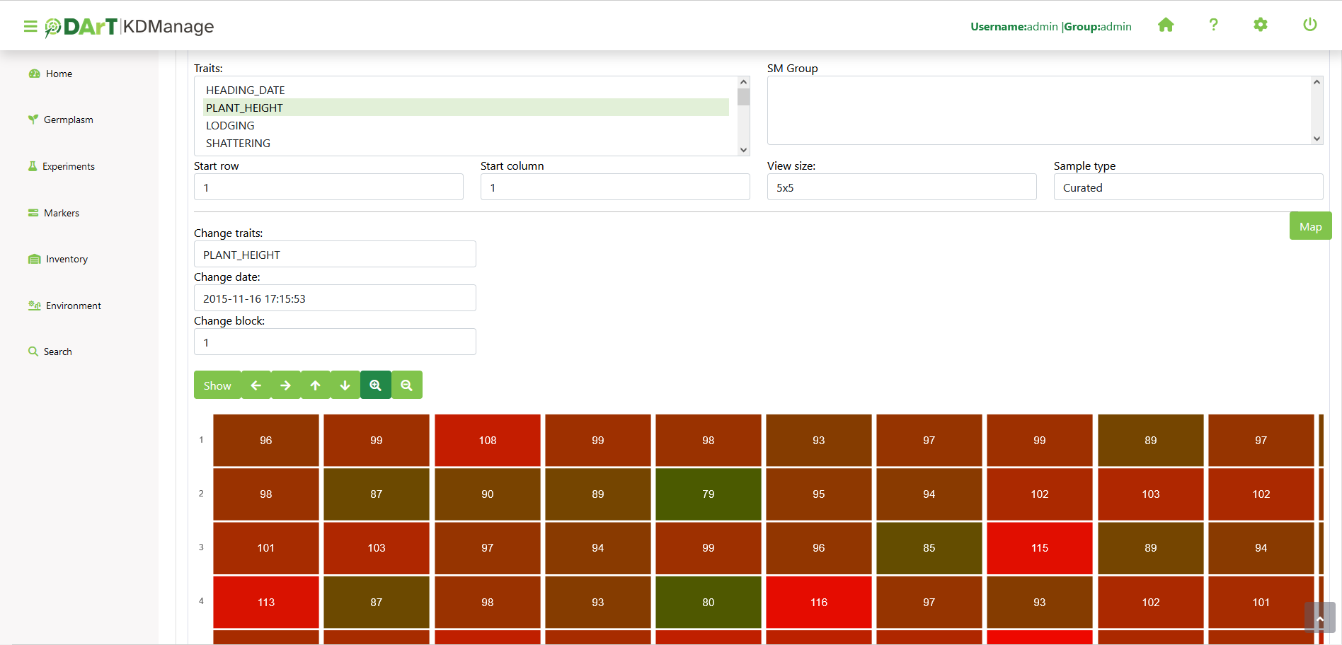A trial data map is a heat map based on trial unit dimensions. Red specifies higher values while blue specifies lower values: