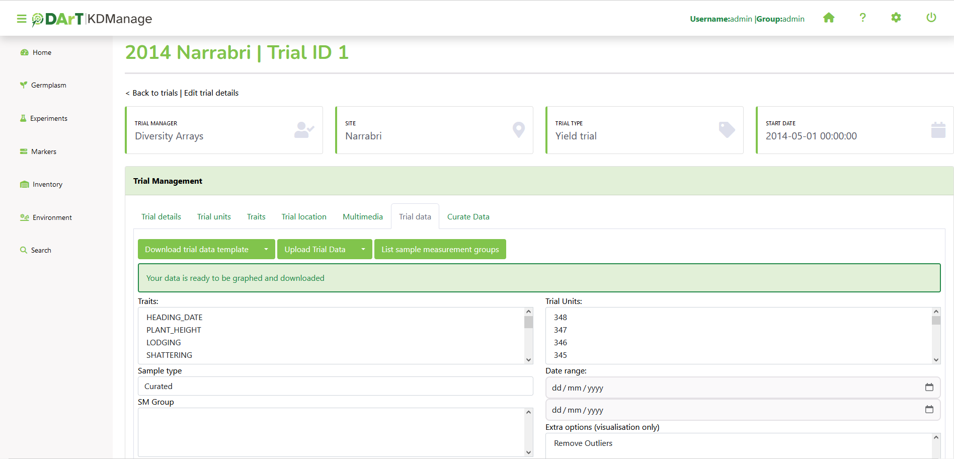 When a trial is selected from the Trials Page, it will be displayed in a Trial View Page (see the image below). The Trial View Page provides all details and data of the selected trial including trial units, trial location, traits, etc. There are also tools available such as data curation.