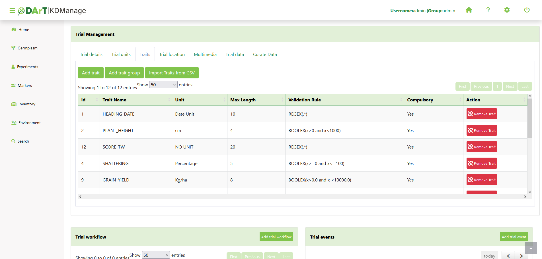 Trial traits can be added individually or in the Trait Groups page.
