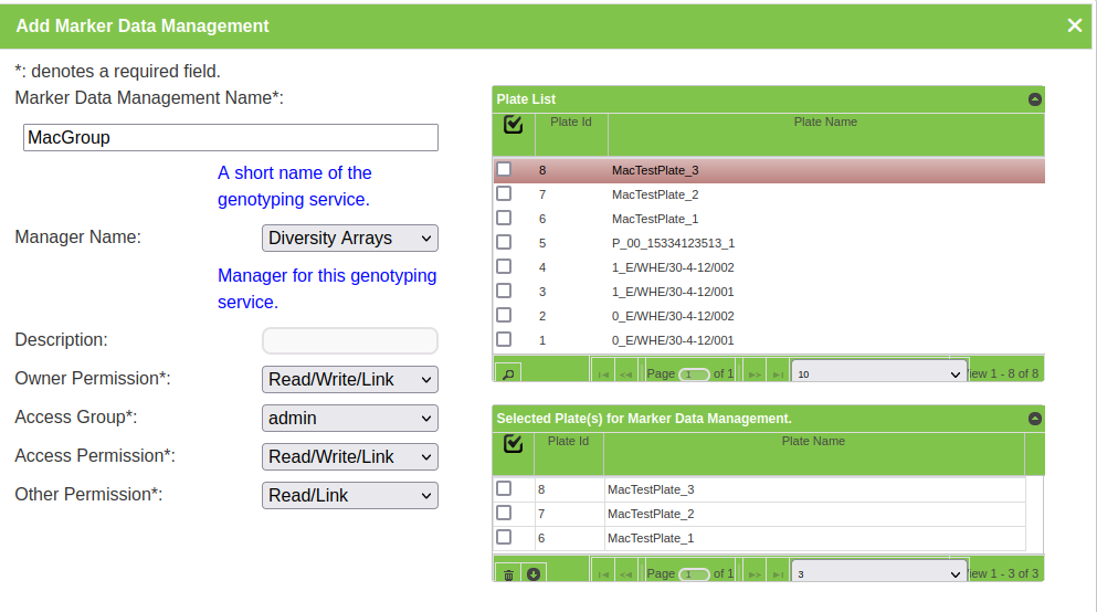 | Selected plates | Mandatory | Plates from DNA management selected for this marker data. Drag and drop plates from the Plates List to add specific plates to this marker data. |