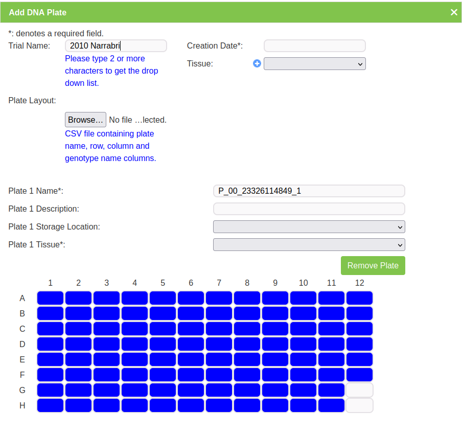 | Trial Name | Mandatory | Trial that this plate is associated with. Upon selecting an existing trial, this will display the relevant plates to this trial. |