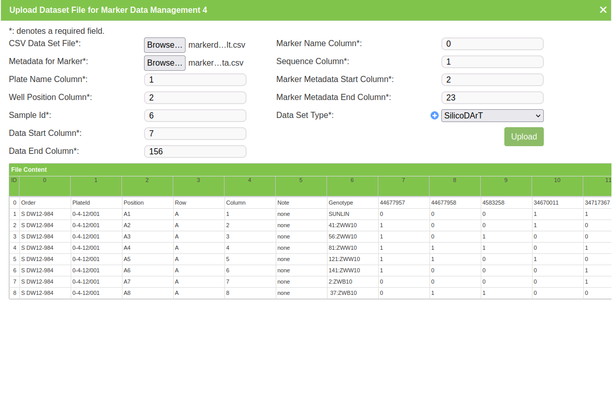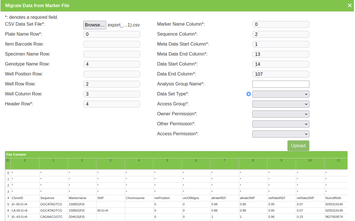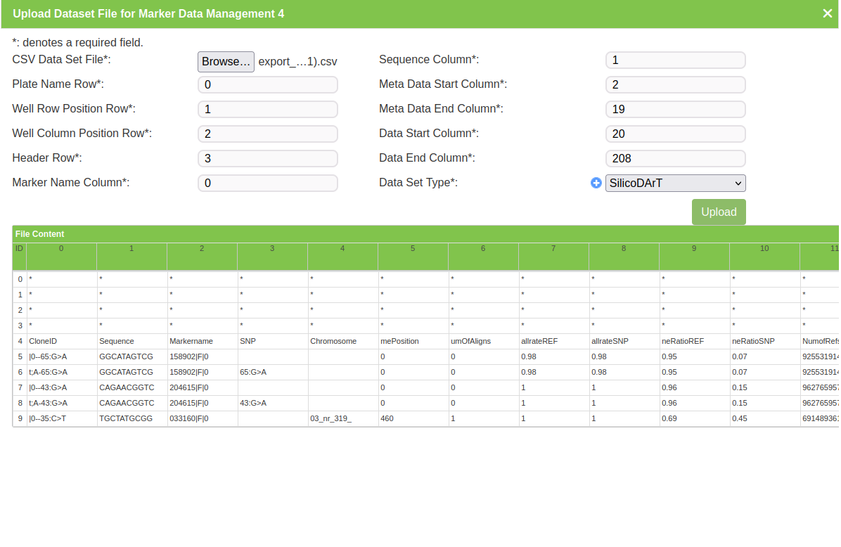 To upload a new dataset to a marker data management group, select Upload Dataset File in the Actions Column for the required group. This will display the Upload Dataset File Window. The window and a table that describes the related fields can be found below: