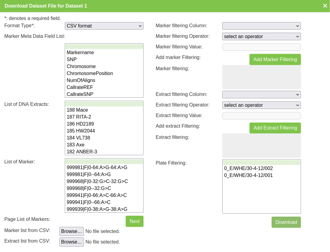 | Extract list from CSV | Upload a CSV of extracts to filter from. Use genotype names. |
