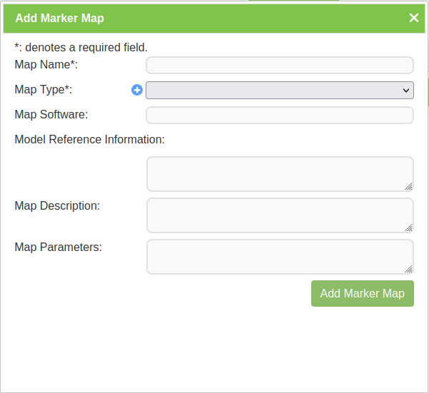 To add a new marker map, select the Add Marker Map Button located in the Marker Map Page to open the Add Marker Map Window. An image of the window and a table explaining the related fields can be found below: