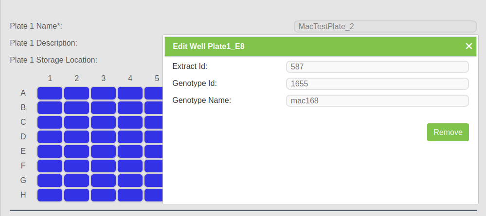Selecting a well will display the Edit Well Plate Window, as displayed in the following image, where the well may be edited or removed using the buttons on the window.