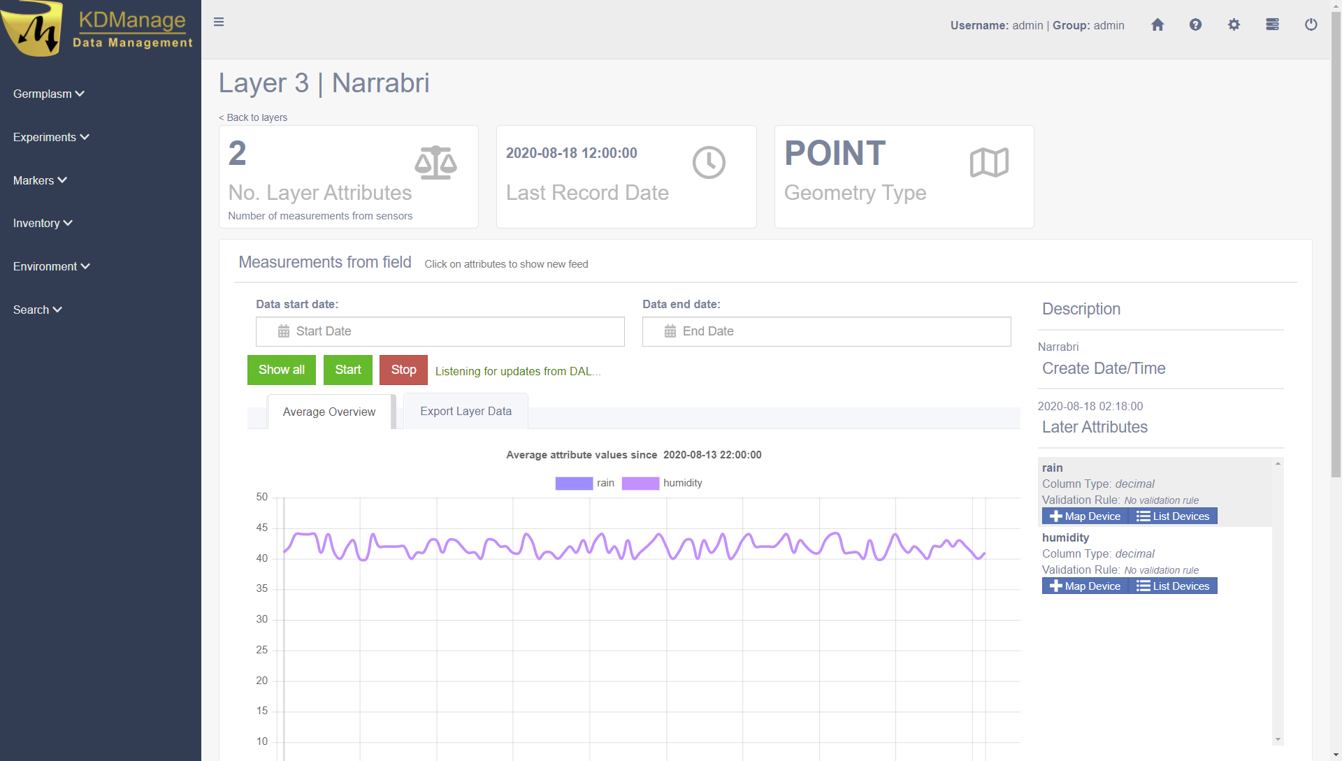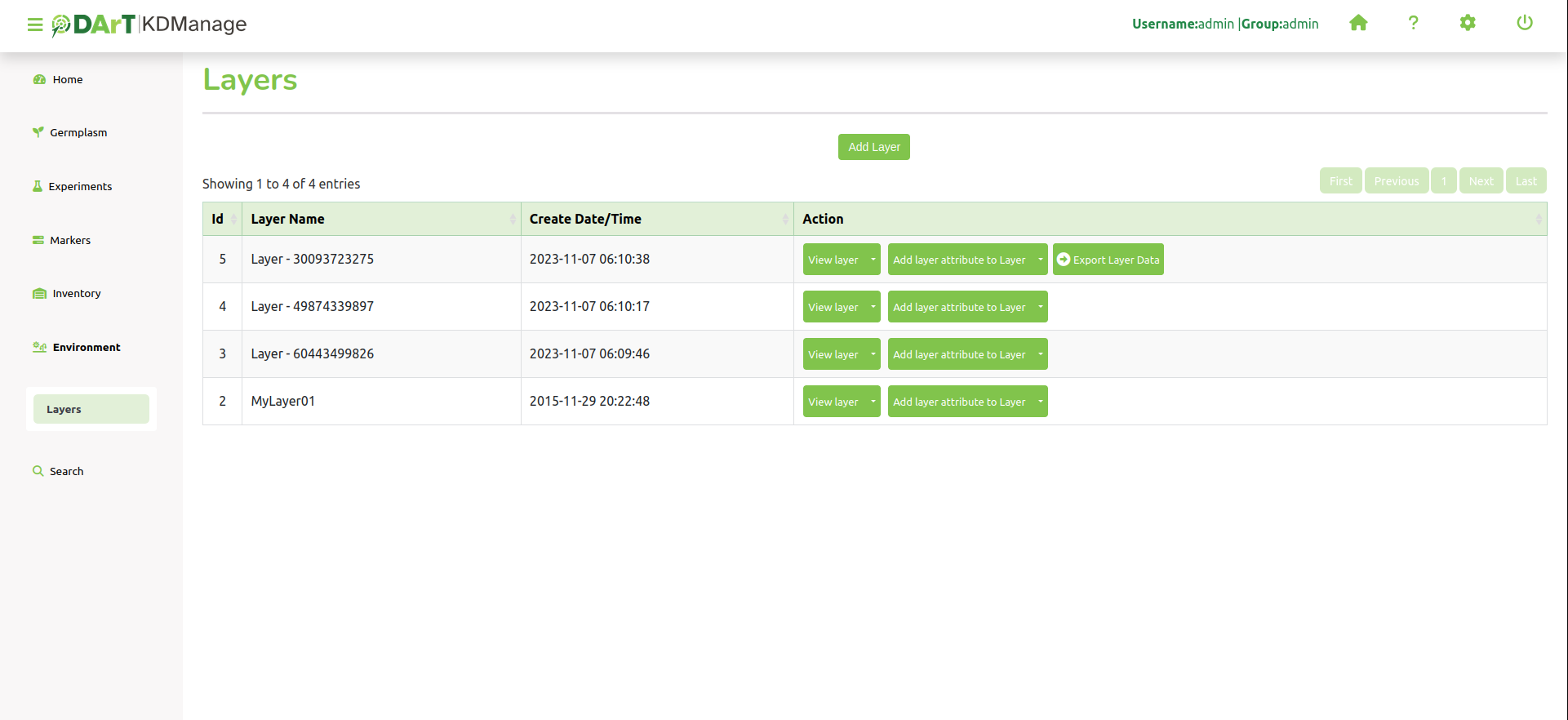 Layers refers to the data group that handles environmental data. A layer can cover multiple locations and include multiple attributes for data collection. The Layers Page is pictured below: