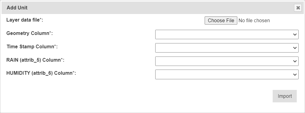 | All Layer Attributes in Layer Columns | Mandatory | Each layer attribute (RAIN and HUMIDITY in the above example) will appear as a field and users will need to specify each column in the CSV for each layer attribute. Users may not skip any of the layer attributes. |